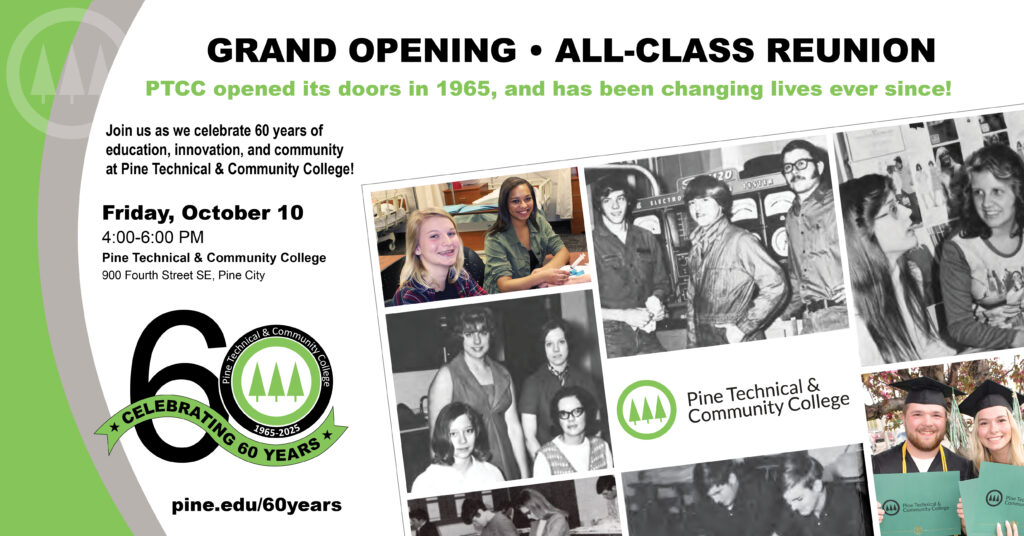 We would love to hear about your student experience at PTCC whether it was from yesterday or back in 1965. If you have history to share with us, please email stories, pictures, or any files to 60years@pine.edu. We are working on an archive of materials to showcase at our September event and will be sharing the findings with the Pine City Historical Society.